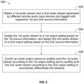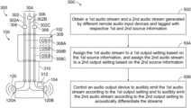 Optionally, the method may include receiving a user command signal. In response to receiving the user command signal, thecontroller102 may assign thefirst audio stream302A to the first output setting308A based on both thefirst source information306 and the user command signal. Alternatively, thecontroller102 may reassign thefirst audio stream302A to a third output setting308C based on the user command signal.