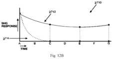 Further, as above, the method inFIG.11 may be practiced with various modifications to the number of blocking or delay times or events. Also, SHG signal may or may not be measured during charge to saturation. Anyway, the method inFIG.11 may be practiced (as illustrated) such that the final gating period takes the SHG signal to null. Confirmation of this may be obtained by repeating the method at the same site in a mode where charging intensity (Ich) is measured or by only observing the SHG signal in (re)charging to saturation.