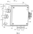 FIGS.6-7 depict an electricpower control box202 that can function as thedisconnect200. The electricpower control box202 generally includes ahousing204 and a cover ordoor206 that together define awaterproof cavity208. Thewaterproof cavity208 receives and supports electrical connections between theE-PTO system100 and thebatteries23 to create a selective electrical coupling between the two.Fittings210 are positioned about the perimeter of thehousing204 and define passages through thehousing204 to receive electrical inputs. Thefittings210 can be rigidly coupled (e.g., welded) or removably coupled (e.g., threaded) to thehousing204 so that a water tight seal is formed between thefittings210 and thehousing204. In some examples, a lowvoltage connector tube209 extends through thehousing204 and into thecavity208 as well. Thehousing204 is configured to be mounted to thebody14 of therefuse truck10. In some examples, thehousing204 is positioned within thecabinet housing64 formed alongside thebody14. As depicted inFIGS.6-7, thehousing204 includes a mountingflange211 extending around at least a portion of thehousing204. The mountingflange211 includes a plurality of mountingholes213 that can be used to fasten thehousing204 to thebody14 of therefuse truck10. In some examples, avent215 is formed within an underside of thehousing204 to allow cooling air to enter into thecavity208.
