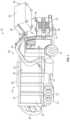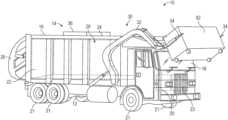 According to an exemplary embodiment, therefuse truck10 is configured to transport refuse from various waste receptacles within a municipality to a storage or processing facility (e.g., a landfill, an incineration facility, a recycling facility, etc.). As shown inFIGS.1-3, thebody14 and on-board receptacle16, in particular, include a series of panels, shown aspanels22, acover24, and atailgate26. Thepanels22,cover24, andtailgate26 define acollection chamber28 of the on-board receptacle16. Loose refuse is placed into thecollection chamber28, where it may be thereafter compacted. Thecollection chamber28 provides temporary storage for refuse during transport to a waste disposal site or a recycling facility, for example. In some embodiments, at least a portion of the on-board receptacle16 and collection chamber28 (e.g., a canopy or a lip) extend over or in front of a portion of thecab18. According to the embodiment shown inFIGS.1-3, the on-board receptacle16 andcollection chamber28 are each positioned behind thecab18. In some embodiments, thecollection chamber28 includes a hopper volume and a storage volume. Refuse is initially loaded into the hopper volume and thereafter compacted into the storage volume. According to an exemplary embodiment, the hopper volume is positioned between the storage volume and the cab18 (i.e., refuse is loaded into a position behind thecab18 and stored in a position further toward the rear of the refuse truck10).