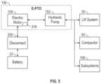 As depicted, the first E-PTO100ais configured to supply pressurized hydraulic fluid to control thelift system30. Accordingly, theelectric motor104 andhydraulic pump102 can each be better optimized to meet the hydraulic power requirements of the lift system, as less overall hydraulic power is needed (in comparison to a single hydraulic pump providing hydraulic power to the entire refuse vehicle10). The cost and complexity ofelectric motors104 andhydraulic pumps102 increases significantly as the size of these components increases, such that providing a hydraulically-independent E-PTO100aspecifically for thelift system30 can result in significant cost savings for therefuse truck10. In some examples, multiplehydraulic pumps102 can be drive by a commonelectric motor104 via a dual shaft or transmission arrangement.
