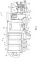 Therefuse truck10 can be considered a hybrid refuse vehicle because it includes both electric and hydraulic power systems. As depicted inFIGS.3-5, therefuse truck10 includes anE-PTO system100. TheE-PTO system100 is configured to receive electrical power from thebatteries23 and convert the electrical power to hydraulic power. In some examples, theE-PTO system100 includes an electric motor driving one or morehydraulic pumps102. Thehydraulic pump102 pressurizes hydraulic fluid from a hydraulic fluid reservoir onboard therefuse truck10, which can then be supplied to various hydraulic cylinders and actuators present on therefuse truck10. For example, thehydraulic pump102 can provide pressurized hydraulic fluid to each of the hydraulic cylinders within thelift system30 on the refuse truck. Additionally or alternatively, thehydraulic pump102 can provide pressurized hydraulic fluid to a hydraulic cylinder controlling thecompactor50. In still further embodiments, thehydraulic pump102 provides pressurized hydraulic fluid to the hydraulic cylinders that control a position and orientation of thetailgate26. TheE-PTO system100 can be positioned about therefuse truck10 in various different places. For example, theE-PTO system100 may be positioned within a housing60 above or within the on-board receptacle16 (seeFIG.4), beneath acanopy62 extending over a portion of thecab18, or within adedicated housing64 alongside thevehicle body14. Although theE-PTO system100 may be in electrical communication with thebatteries23, theE-PTO system100 can be separate from and spaced apart from thevehicle frame12.