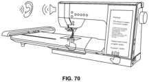 Referring now toFIGS.82-84, various views and diagrams are shown that are related to providing tactile feedback to the user in relation to the use of the sewing machine. Tactile feedback is feedback provided to the user via means that can be felt. For example, a control component (e.g., a knob, a button, a pedal, a lever, slider, or the like, such as the components shown inFIG.83) that the user is interacting with may vibrate slightly when a particular position is reached, or there may even be resistance to further movement of the control object. Small vibrations can also be provided through surfaces of the sewing machine on which the users hands and fingers may rest during use, such as the sewing bed. Tactile feedback can be used to alert the user of a particular condition of the sewing machine or workpiece or can be used as further reinforcement to the user that an action taken by the user has been received. For example, the sewing bed can vibrate underneath the workpiece and users hands when the user has deviated from a desired sewing path. Or, the knob or a button can vibrate to indicate that the button was pressed or the knob has reached a particular position. Tactile feedback can also replace mechanical features that would provide similar feedback, such as detents in a knob that indicate particular positions around the knob have been reached. Haptic feedback can be used on any sewing machine surface. Vibrotactile haptic feedback, via piezoelectric sensors, can be used on any surface of the sewing machine and can be used to replace mechanical user interfaces. Piezoelectric and capacitive sensors can be arranged in an array under an OLED or similar type screen that is formed such that it replaces traditional plastic sewing machine covers. The presence of the user's fingers on or near the OLED interface engages menus that are activated based on user requests or current sewing actions and relevant user interface needs, such as, for example, finger taps, sliding, and scrolling motions for threading, adjusting thread tension, and activating or deactivating sewing accessories. Other forms of haptic feedback can include force, electro-tactile, ultrasound, air vortex rings, and thermal haptic feedback.