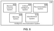 FIG.5 illustrates the intelligence andautomation system110 according to some embodiments of the present disclosure. In embodiments, the platform includes an intelligence andautomation system110. The intelligence andautomation system110 may include amachine learning system502, anartificial intelligence system504, arecommendation engine506, aservice matching engine508, anadvertising system508, and/or anotification system510.
