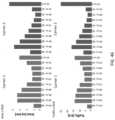 FIG.35 is a graph of distribution of users by average downlink Physical Resource Block (PRB) allocation. Real-time monitoring shows downlink resources allocated to each user. Allocations occur many times per second. A significant concentration of users on 739 MHz are allocated resources for voice service. Most users on 2165 MHz are allocated resources common for high-speed data.