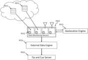 FIG.93 illustrates a block diagram showing the data flow of one embodiment of the external data engine. The engine contains at least onedata monitoring sensor9310, each of which is operable to receive external data from an external data source, including but not limited to a third-party database9311 or electromagnetic signals. Each data monitoring sensor receives data according to at least oneupdate interval9312. Additionally, the data monitoring sensors are in communication withgeolocation engine9313 and are operable to use the geolocation engine to geolocate received signals. The external data captured by the data monitoring sensors is then sent toexternal data engine9314. The external data engine processes and analyzes the received external data, creating processed external data, which is sent to tip andcue server9315. The tip and cue server, using both processed external data from the external data engine and analyzed data from the data analysis engine, is operable to generate actionable data and/or at least one report and/or alarm.