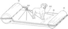 Thecontrol module36 may be comprised of a sensor system. In some embodiments, as shown inFIG.38, thesensor system3810 may include at least oneactivity sensor3812,camera3814, orweight sensing device3818. Theactivity sensors3812 may include any power transmitting sensor known in the art such as, for example, motion sensors or proximity sensors. Additionally, thesensor system3810 may be configured to include differenttypes activity sensors3812 such as, for example, infrared sensors and magnetic sensors.FIGS.27-30 show thesensor system261 capturing information on the pet waste machine10. In one embodiment, theactivity sensor260 in thesensor system261 may be configured to capture the presence of the pet22 throughmotion detection262. Motion detection may be achieved through infrared detection or optical detection.Cameras3814 included in thesensor system3810 may be capable of capturing photographs and video. Furthermore, thecameras3814 may be configured to operate in a nighttime infrared mode to capture images or videos when thesensor system3810 is in the dark. Additionally, theweight sensing device3818 may be configured to capture the mass of objects present on theflat surface3804. Thesensor system3810 may also be configured to detect objects for an extended period of time (‘persistent detection”), which may prompt an error notification for the machine. The time intervals for persistent detection may include, but are not limited to, 5 minutes, 10 minutes, and 15 minutes. For example, an animal remaining on the flat surface for a prolonged period of time would be considered abnormal, which would prompt a notification to the user interface to investigate the flat surface either by reviewing an image or physically inspecting the flat surface. Alternatively, placing the pet waste machine to close to an object may result in the sensor detecting the object and prompting an error notification. In another embodiment, thepet system3800 may be configured where thecontrol module3808 is not coupled to thepet waste machine3802. Accordingly, thecontrol module3808 operates remotely from thepet waste machine3802 and is in direct or wireless communication with thepet waste machine3802 and theserver3822. In remote embodiments, thecontrol module3808 retains the same functionality except for the drive mechanics, which remain in thepet waste machine3802. For example, thecontrol module3808 in one embodiment is a stand-alone device with acamera3814 andsensor3812 located independently from thepet waste machine3802. In a further embodiment, thepet system3800 may comprise apad3806,control module3808,server3822, anduser interface3820. This embodiment allows greater portability for a user because thepet waste machine3802 is no longer required.