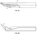 FIG.9A shows the work element ofFIG.8 with the completed part-off excision shown in the top illustration. In the bottom illustration,FIG.9B, theflexible scoopula15 is in its maximally extended position within a portion of a vascular structure, in which position it can remain until forced to be more normally aligned by an advancing top external cutting element or component such asscoopula13. This would ensure that no bits or chunks of debris from an intervention would float downstream before being captured and transported proximally all the way into a transfer magazine element and storage chamber element of a device. A suitable transfer magazine and other structures are disclosed in U.S. patent application Ser. No. 14/050,771, incorporated by reference above. Again outlined by dashes inFIG.9A is one or more channel element(s) including exit opening near the beak tip. The location of this exit port ensures that any guidewire or other instrument would remain clear of the part-off mechanism, and at the same time, would be directable by beak flexing or rotation.