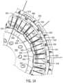FIG.15 is a sectional fragmentary radial elevation view of an upper portion of the rotary filling machine ofFIG.13;