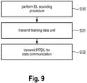 FIG.9 shows a flowchart of an embodiment of the operation of a first access point AP1. In a first step S30 AP1 performs a sounding procedure with one or more first stations to determine resource unit allocation and beamforming configuration for use in subsequent communication with respective first stations. In a second step S31 a training data unit containing signaling information on the determined resource unit allocation and on the determined beamforming configuration is transmitted, wherein the training data unit is transmitted with a beamforming configuration derived from the determined resource unit allocation and the determined beamforming configuration. The training data unit may thus be transmitted with the determined beamforming configuration or a beamforming configuration that is determined based on the determined beamforming configuration (and/or the determined resource unit allocation). More precisely, the latter refers to extending the beamforming weights to frequency subcarriers corresponding to a whole channel or frequency block to which the particular RUs belong or smoothing in frequency or applying beamforming weights corresponding to the determined configuration however adapted for statistical channel knowledge. The advantage of the latter is slower variation in time, while proving an acceptable indication of the level of interference that oSTAs would experience from the AP1. In a third step S32 a physical protocol data unit is transmitted to said one or more first stations, said physical protocol data unit comprising a session index, training sequences and data to be transmitted to the respective first station.