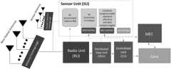 RegardingFIG.81, the sensor unit has three (3) major subfunctions: RF capture (I&Q), RF environment analysis (channelizer, detection, classification, identification, geolocation, and associated ML algorithm to get RF awareness), and customer programable and data analysis (customer actionable data). The present invention provides for several options for interfaces with the RAN, including all RF capture being split between RU and DU (depending on the split option used); RF environment analysis being split between DU and CU (depending on the split, and some basic data analysis (only for channel interference) will be in the CU); noting that most of the customer inputs for programmable and data analysis functions are operable in the MEC and core.