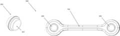 As noted previously, thebody portion102 can include two ends104,106 on the distal and proximal ends of thebody portion102. The ends can be loops that are generally round. In one embodiment, the loops can have the dimensions of 0.724″ outer diameter and can be 0.250″ thick. These dimensions are provided for example only and are not intended to be limiting. The band can be formed as a unitary structure that is formed from any elastomer material, such as thermoplastic elastomer (TPE). In some embodiments the band can be formed from any one, or combination of, silicone-liquid or molded, rubber, TPE, latex, TPV, Santoprene, bungee cords, medical grade elastomeric tubing, or other elastic or plastic materials. The band can be formed via overmolding, as will be discussed below. Due to the overmolding process, the loops can be imparted with a generally V-shapedgroove108, as seen in at leastFIG.1A,FIG.2A, andFIG.3A. Such agroove108 can retain abushing200 disposed within the respective loop, to prevent thebushing200 from moving axially within the loop.