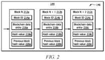 Eachblock212a-cin theblockchain146 comprises a block identifier (ID)214a-cand information derived from apreceding block212a-c. For example, everyblock212a-cin theblockchain146 includes a hash220a-cof theprevious block212a-c. By including the hash220a-c, theblockchain146 comprises a chain ofblocks212a-cfrom a genesis block212 (e.g., block212aor a block beforeblock212a) to thecurrent block212c. Eachblock212a-cis guaranteed to come after theprevious block212a-cchronologically because the previous block's hash220a-cwould otherwise not be known. In one embodiment, blocks212a-cin ablockchain146 may be linked together by identifying apreceding block212a-cwith a cryptographic checksum (e.g. secure hash algorithm (SHA)-256) of its contents (e.g., thenon-public information124 and additional metadata including block ID214, hash value218, and previous block hash value220) which serves as each block's unique identifier. Links are formed by storing the cryptographic checksum identifier of oneblock212a-cin the metadata of anotherblock212a-c, such that theformer block212a-cbecomes the predecessor of thelatter block212a-c. In this way, theblocks212a-cform a chain that can be navigated from block-to-block by retrieving the cryptographic checksum of a particular block's predecessor from the particular block's own metadata. Eachblock212a-cis computationally impractical to modify once it has been in the blockchain because everyblock212a-cafter it would also have to be regenerated. These features protect data stored in theblockchain146 from being modified by bad actors which provides information security. When a network node142 creates an entry (e.g. one or more blockchain data entries216a-cin ablock212a-c) in itsblockchain record144, theblockchain146 for all other network nodes142a-n(seeFIG.1) in the distributed network is also updated with the new entry. Thus, data entered in ablockchain146 is available and accessible to every network node142a-n(seeFIG.1) with a copy of theblockchain record144. This allows the data stored in theblock212a-cto be accessible for inspection and verification at any time by any device with a copy of theblockchain record144.