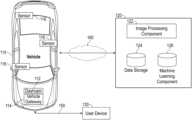 In some embodiments, thebackend server120 further includes animage processing component122 and/ormachine learning component126. In some embodiments, theimage processing component122 can be utilized to process images stored in the data storage to use the images in another application. For example, theimage processing component122 may process the images to determine a driving behavior for each driver. In some embodiments, the processed results also can be used to train themachine learning component126. In some embodiments, themachine learning component126 may include one or more parameters, used for analyzing a region of interest of an object. For example, thedashcam112 can access themachine learning component126 and use the updated parameters in themachine learning component126 to analyze a region of interest of a detected driver to determine whether the dashcam is installed in its acceptable position. In this example, thedashcam112 can store the parameters received from themachine learning component126 and utilize the parameters for determining and analyzing the region of interest of the detected driver.