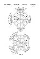 The structure of the rib plates can be better understood with reference to FIGS. 7 and 8 which are front views of the top and bottom rib plates respectively. Each plate has eight rib mounting locations defined by pairs oftabs 44 with aligned transverse bore holes 46 each defining a rib assembly pivot axis (the contiguous ones oftabs 44 being shown as joined along their common edge). The rib mounting locations of the top rib plate are offset by 45° from the rib mounting locations of the bottom plate. When the two plates are positioned on top of one another they provide a total of 16 rib mounting locations evenly spaced 22.5° apart. As shown in FIGS. 5 and 6, thetabs 36 of the top rib plate curl downward and those of the bottom plate upward so that the rib assembly pivot axes at all of the mounting locations are at the same level with respect to thecentral axis 11. Thus the pivot axes around which the rib assemblies pivot, i.e., theaxes 47 of the bore holes 46, are substantially coplanar so as to define a " pivot plane" which is indicated in side view in FIGS. 5 and 6 by dashedline 38.