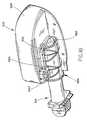 As best seen in FIGS. 1 and 4,mirror subassembly12 includes a mirror casing orhousing18 and areflective element assembly20, which is mounted inhousing18 by apositioning device22, preferably an electrically operated actuator. Such electrical actuators may incorporate resistive track or Hall Effect sensors. It should be understood that other positioning devices may be used, including manually operated actuators, a remote manually operated actuator, such as a BODEN cable actuator or the like.Housing18 is preferably injection molded from a suitable plastic, such as nylon, acrylonitriale butadiene styrene (ABS) or suitable resinous plastic, or the like which is commercially available under the trademark TERLURKAN KR2889® by BASF Company of Wyandotte, Mich. Alternatively, other resinous, melt processible plastics or moldable materials such as mineral filled or glass filled nylon or polyester or polypropylene can be used to formhousing12. A suitable nylon is 13% glass modified nylon 6:6 sold as ZYTEL 71G13L® by I. E. DuPont de Nemours & Company of Wilmington, Del. or PA123G13BK-47 by Bay Resins, Inc. of Millington, Md. A suitable polypropylene is TENITE P6M4Z-007® by Eastman Chemical Products of Kingsport, Tenn. Alternately,housing18 may comprise a reinforced nylon plastic, thermo plastic, polypropylene, or other similar thermo plastic or thermoset materials.