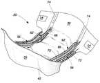 In addition to barrier cuffs, the leg cuffs of the present invention preferably further comprise gasketing cuffs56. The gasketing cuffs56 are disposed adjacent the periphery of thediaper20, preferably along eachlongitudinal edge30 so that the gasketing cuffs56 tend to draw and hold thediaper20 against the legs of the wearer. While the gasketing cuffs56 may comprise any of several means as are well known in the diaper art, a particularly preferred gasketing cuff construction comprises aflexible side flap58 and flapelastic members60, as is described in detail in U.S. Pat. No. 3,860,003, issued to Buell on Jan. 14, 1975 and incorporated herein by reference. In addition, a method and apparatus suitable for manufacturing a disposable diaper having elastic gasketing cuffs56 are described in U.S. Pat. No. 4,081,301 entitled “Method and Apparatus for Continuously Attaching Discrete, Stretched Elastic Strands to Predetermined Isolated Portions of Disposable Absorbent Articles” which issued to Buell on Mar. 28, 1978 and which patent is incorporated herein by reference.