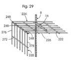 FIG. 28 shows the favored embodiment for attaching thewire side panels228 to thewire shelves224. In this embodiment, thewire side panels228 are attached to thewire shelf224 by means ofhangers244, preferably formed from the end of thecross wires276 of the wire side panel. Thehangers244 fit over thesupport wires222 at the end of thewire shelf224 and thus support thewire side panel228. Hangers are favored over the other embodiments shown below due to the less likelihood of damage due to snagging of clothing and similar items.
