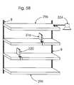 FIG. 58 shows yet another embodiment, withwall standards8 andshelf brackets16 supporting the rear corners ofsheet metal shelves296. In this embodiment, the omission of the front legs and supports provides a cleaner look and improved access to the shelves but with some reduction in rigidity and strength. FIG. 58 also shows a partition assembly with a clamping member for asheet metal shelf316, a partition assembly with a screw fastener forsheet metal shelving320, and a lamp assembly with a clamping member forsheet metal shelving324. These partition and lamp assemblies have been previously described in a U.S. Pat. No. to Stuart (5,655,670) and U.S. patent applications by Stuart Ser. Nos. 09/137,891 and 09/161,259.