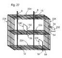 FIGS. 25 and 26 show two embodiments for supporting the shelves by theside panel brackets210. In FIG. 25, theshelf12 is supported by an opening or groove212 in theside panel bracket210, while in FIG. 26, theshelf12 is supported using asupport rod216. Additional approaches (not shown) include the use of brackets or flat spoons that fit into holes in the side panel bracket, as well as the use of the Swedish type of wire shelf support (where the center portion of the wire fits into a groove in the shelf and the ends of the wire fit into holes in the side panel bracket) or the use of shelf support strips or standards and brackets. Of course, if additional rigidity and strength are desired, the shelves could be fastened directly to the side panels using strong adhesive or mechanical means such as screws.