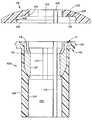 Referring again to thelip110 of theport member100, thelip110 includes acircumferential latch mechanism121, which comprises a sloped extending ledge which is designed to engage a similar conformation on thecap member101, which is described hereinbelow, with reference to FIG.2. Thecap member101 comprises a disk shape, having acentral opening103. Theupper portion107 of theopening103 is narrower in diameter than theopening102 in theport member100. This difference in diameters permits thecap member102 to act as a retaining means for any docking member (see discussion of docking member with respect to FIG. 5) which may be inserted into theopening102 in theport member100. In addition, thecap member101 has a radial carved outgroove105 which corresponds to, and aligns with, theaxial channel119 formed in thesidewall104 of theport member100. Thegroove105 receives the deep brain stimulation electrode therethrough as well.