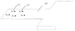 Referring now to FIG. 4, a nanoarray of electrodes90 is built in alinear microtube100 with the spacing and electro-chemical composition of the nanoelectrodes varied in such a way to correspond exactly to the distance between given base pairs of a linear piece of DNA or ribonuleic acid (RNA)110. In this case, the nanoelectrodes are built using only two variables: precise spacing and electrochemical composition (not height) favoring position-specific binding of specific base pairs of DNA or RNA to matching nanoelectrodes. The principle that is applied here is that DNA is known to behave as a linear molecule when flowed in a microtube and that this rate of flow can be controlled and measured with precision. Furthermore, the distance between 10 DNA base pairs being precisely 34 Å, the nanoelectrodes can be spaced precisely in multiples of 3.4 Å as shown in120. By varying the spacing and charge and/or composition of the nanoelectrodes and by measuring the conductance changes over time in sequentially placed nanoelectrodes, an entire sequence is created, based on the timing of the signals of position-specific nanoelectrodes. The full DNA (or RNA) sequence is then reconstructed with the help of a microcontroller (or microprocessor) which can also control the flow rate in the microtube.