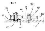 FIG. 7 is a cross-sectional view of a portion of the machine, showing the groovedpulley38 with integral sintered brass bearing101 andcord68 passing around groovededge103. The pulley is mounted tobase21 by ashoulder screw102. Pressing againstcord68 ingroove103 is rubber idler35 with sintered bearing107 and held onto a spring-loadedbracket36 byshoulder screw106.
