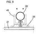 FIG. 9 is a cross-sectional view of a portion of the machine showing thecontrol bracket43 for the friction pad supportarm tensioning spring28. Thebracket43 is attached to controlarm39. The structure depicted moves in the directions indicated to vary the tensioning force applied to the friction pads.