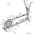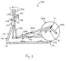 BACKGROUND OF THE INVENTIONExercise equipment has been designed to facilitate a variety of exercise motions. For example, treadmills allow a person to walk or run in place; stepper machines allow a person to climb in place; bicycle machines allow a person to pedal in place; and other machines allow a person to skate and/or stride in place. Yet another type of exercise equipment has been designed to facilitate relatively more complicated exercise motions and/or to better simulate real life activity. Some examples of elliptical motion machines are disclosed in published German Patent Appl'n No. 29,19,494 of Kummerlin; U.S. Pat. No. 4,185,622 to Swenson; U.S. Pat. No. 5,242,343 to Miller; U.S. Pat. No. 5,423,729 to Eschenbach; and U.S. Pat. No. 5,529,555 to Rodgers, Jr.