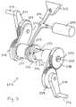 Parallel flanges718 extend upward from the rear of thebase710, and at least threerollers720 are rotatably interconnected therebetween. Therollers720 cooperate to support the circumferential rim of aflywheel730. Alead screw740 is rotatably mounted between diametrically opposed portions of the flywheel rim, andparallel braces734 extend between discrete portions of the flywheel rim on opposite sides of thelead screw740. Amotor780 is mounted between central portions of thebraces734 and connected to thelead screw740 in such a manner that operation of themotor780 is linked to rotation of thelead screw740. Blocks744 are threaded onto thelead screw740 on opposite sides of themotor780 and disposed between thebraces740. The blocks744 are threaded in such a manner that rotation of thelead screw740 causes the blocks to move radially in opposite directions relative to one another.