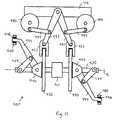 Left andright arms483 have first ends connected to aframe member412 and pivotal about a common axis relative thereto, and second ends connected to respective left andright bearing assemblies433 and pivotal about parallel axes relative thereto. Each bearingassembly433 engages opposite sides of arespective flywheel430. First ends of left andright links484 are rotatably connected to intermediate portions ofrespective arms483, and second, opposite ends are rotatably connected to respective left andright rollers480. The rollers are mounted on theframe member412 and selectively rotated in opposite directions to pull thearms483 apart or push thearms483 together and thereby moverespective flywheels430 andpivot bushings440 to adjust the crank radius on each side of theassembly404.
