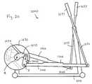 When thehandle bar270 is resting against thestop277 and the crank is set at a relatively smaller radius, the center of a person's foot F and underlyingfoot supporting link260 move through the generally elliptical path shown in FIG.7. When thehandle bar270 is resting against thestop277 and the crank is set at a relatively larger radius, the center of a person's foot F and underlyingfoot supporting link260 move through the generally elliptical path shown in FIG.9. As suggested by FIGS. 8 and 10, a person may pull rearward on the handle bars270 to elevate the forward ends of the foot paths and carry a portion of his weight during exercise.