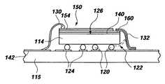 FIG. 9 also illustrates an electrode structure wherein one conductive connection is made to anouter electrode154, and the other to a laterally extendedinner electrode160, and thecapacitor coupon150 is electrically isolated by insulating ordielectric layer140 from thebackside126 ofdie114. Of course, the thickness of thecapacitor coupon150 and ofdielectric layer140 is greatly exaggerated for clarity. Further, if a ground or reference electrical connection is effected directly between thebackside126 ofdie114 andinner electrode160 ofcapacitor coupon150, it will be appreciated that only one connection betweencapacitor coupon150 and aconductive trace142 oncarrier substrate115 may be required.