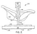 DETAILED DESCRIPTION OF PREFERRED EMBODIMENT(S)A first preferred embodiment of the low-profile swing assembly of the present invention is shown in FIGS. 1-5 generally at20. Low-profile swing assembly20 includes a disk-shaped base member22 and twolegs30,32 which extend generally vertically from an upper face thereof.Base member22 includes astationary base25 and arotational base26 supported thereon bywheels27 that are received in molded recesses28 (FIG.6).Rotational base26 has a stepped configuration,center portion23 being raised to provide room for the upper halves ofwheels27.Rotational base26 can be turned throughout a 360° arc relative tostationary base25 to provide the infant with a change of visibility (both what it sees and where it can be seen from).Casters29 are preferably provided beneath stationary base25 (FIGS. 2-4) to facilitate its movement from place to place, but may be omitted to save manufacturing cost without significantly impacting the utility of the device.Base member22 is extremely stable: even with a 200 lb man standing on the edge ofbase22, it will not tip over.