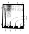 FIG. 54 is a schematic of the type of histogram generated from the image data for the purpose of setting a threshold for determining when to begin image data collection in the system shown in FIG.27. The horizontal axis in FIG. 54 identifies a digital value of intensity associated with the light received by a pixel in thevideo camera304. The vertical axis in FIG. 54 identifies the number of pixels having each digital value of intensity. Because of the bright field illumination due to the illuminating means309, all pixels in the ROI have an intensity towards the upper end of the intensity scale. The histogram in FIG. 54 includes data only for the pixels in the ROI between thelines583,584.