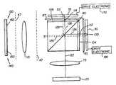 Light impinging onreflective LCD modulator90 is of the s-polarization state124. Light that is modulated atreflective LCD modulator90 is reflected p-polarized126, and passes through thepolarizing beamsplitter80 to the image plane. Light impinging-onreflective LCD modulator95 is p-polarizedstate128. Modulated light fromreflective LCD modulator95 is reflected s-polarized129 and passes through thepolarizing beamsplitter80 and is imaged at theimage plane130. Because light directed to the image plane is of opposite polarization states, polarization sensitive elements between thepolarizing beamsplitter80 and the image plane should be avoided.