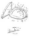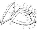 Referring again to FIGS. 1 and 2,surface discontinuity70 preferably comprises a generallyarcuate ridge78. In preferred form,ridge78 extends from anoutboard side80 ofcomposite shell16 to aninboard side82 and is preferably continuous between terminal ends90 and92 which taper to form a smooth transition betweendiscontinuity70 and surface16aofcomposite shell16. For example, terminal ends90 and92, which wrap inwardly toward each other, may be spaced a distance in a range of about 10 to 35 mm from lower perimeter portion ofshell16, more preferably, about 20 to 30 mm and, most preferably, about 20 to 25 mm. Furthermore, upper portion ofridge78 is preferably spaced from groove72 a distance equal to or greater than X, where X is the distance betweengroove72 andperipheral edge94 ofmirror case12. In addition,ridge78 is preferably substantially parallel withgroove72 over at least a portion ofgroove72.