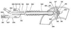 At the end of the cardiac surgery, the filter is depressurized and removed from the ascending aorta. The syringe lock is released and, while holdinghandle380, the pressurizing cannula is drawn back. This will cause release of saline frominflation seal317, and will retrieve the filter mesh, inflation seal, and pressurizing cannula back into and under the handle, as it was configured before deployment. Notably, embolic material collected in the filter is also trapped under the handle at its enlarged segment. Optionally, the inflation seal may be deflated before pull-back of the pressurizing cannula by operating the syringe to withdraw saline from the inflation seal. Once the associated filter has been retrieved under the handle, the cannula can be removed from the patient without damaging the aortic incision by using standard procedures.