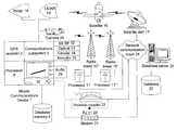 The radio used for the communications subsystem can be radio frequency AM, FM, spread spectrum, microwave, light (infrared, visible, UV) or laser or maser beam (millimeter wave, infrared, visible), or for short distance communications, acoustic or other communications may be employed. The system preferably employs an intelligent transportation system (ITS) or Industrial, Scientific and Medical (ISM) allocated band, such as the 915 MHz, 2.4 MHz or 5.8 GHz band. (The 2.350-2.450 GHz band corresponds to the emission of microwave ovens, and thus the band suffers from potentially significant interference). The 24.125 GHz band, corresponding to K-band police radar, may also be available; however, transmit power in this band is restricted, e.g., less than about 9 mW. The signal may be transmitted through free space or in paths including fiber optics, waveguides, cables or the like. The communication may be short or medium range omnidirectional, line of sight, reflected (optical, radio frequency, retroreflector designs), satellite, secure or non-secure, or other modes of communications between two points, that the application or state-of-the-art may allow. The particular communications methodology is not critical to the invention, although a preferred embodiment employs a spread spectrum microwave transmission.