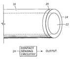 FIG. 2 depictsdistal end14 ofIMD10 in accordance with an embodiment of the present invention.Sensor20 is shown mounted onIMD10 atdistal end14.Channel22, which runs the length ofIMD10, is preferably not obstructed bysensor20 so that devices such as surgical lasers may pass throughsensor20. Electrical leads, not shown in FIG. 2, connect tosensor20, run axially throughIMD10, and connect to contactsensing circuitry24.Contact sensing circuitry24 then determines the FR characteristics ofsensor20, indicating whether or notdistal end14 is in contact withtissue surface16 and, in some embodiments, the perpendicularity ofIMD10 totissue surface16. Those of ordinary skill in the art will recognize thatcontact sensing circuitry24 may be electrically coupled tosensor22 in ways other than running electrical leads axially throughIMD10, and the present invention is not intended to be limited to any particular method of connecting the components.