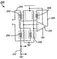 FIG. 5 describes amonolithic isolation circuit200 that uses an isolated output current304 replicator of a current in an isolated inputcurrent loop306. The low voltage circuitry input is300 and302, which causes a current to flow in a micro-electrical mechanical (MEMs) fabricated low-loss input coil306. Aninsulation layer308 isolates theinput coil306 from anoutput coil304 fabricated with conventional IC fabrication techniques.Operational amplifier310 amplifies the input signal and provides this signal to the high voltage circuitry/switches viaoutput312. This design includes a 2500-volt standoff and transmission rates up to 100 Mbits/second at a reduced power level over optical methods. Again, this technology could be integrated on top of a standard CMOS wafer allowing similar advantages as described above.