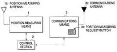 Throughout the drawings,reference numerals1 and16 designate position-measuring means;1a,16a,18a,21a,and24adesignate position-measuring antennas;2,8,12,14,17,20,23,26, and27 designate control sections;3,4,5,6,7,11, and13 designate communications means;3a,4a,5a,6a,7a,11a,and13adesignate communications antennas;3band7bdesignate position-measuring request buttons;9 designates a storage section;10 and15 designate timers;28 designates an acceleration sensor;29 designates a gyroscope;18,21, and24 designate signal demodulation section; and19,22, and25 designate position-measuring computation sections.