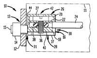 DETAILED DESCRIPTION OF THE PREFERRED EMBODIMENTFIG. 1 depicts an exemplary embodiment of anelectrical enclosure10 having aremovable access panel12 attached to achassis11. Anelectric device14 having apushbutton15 is installed through anopening13 in theaccess panel12 in such a manner that a screw-typeelectrical terminal16 of theelectric device14 is located within theenclosure10 when thepushbutton15 is located to be accessible from outside of theenclosure10. Theterminal16 includes a fixed element in the form of aterminal blade18 threaded to receive ascrew20, and a movable element in the form of awasher22 for clamping awire24 between the fixed andmovable elements18,22, with thescrew20 clamping thewasher22 andwire24 against theblade18. Themovable element22 can be provided in many forms including a simple round washer, or various shaped parts known in industry as pressure plates or saddle clamps.