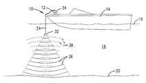 During additional operation ofsonar depth sounder10,processor22 controls the transmitter portion of transmitter/receiver combination30 to emit a plurality of output pulses. Those pulses causetransducer32 to emit a series of sonar signals into the body ofwater16. Particularly,transducer32, when activated by the transmitter, sends out an ultrasonic pressure wave in an expanding pattern into the body ofwater16. As will be readily appreciated by those skilled in the art, that expanding pattern defines what is often referred to, in simplified terms, as a cone of detection. FIG. 1 illustrates the expanding ultrasonic waves emitted fromtransducer32 byreference numeral36. Theultrasonic waves36 bounce, or echo, off of thebottom surface20, sending back expansion echo waves, designated generally byreference numeral38. As will be readily understood, echos also reflect off of objects suspended within the body ofwater16, including particularly fish. The receiver portion of transmitter/receiver combination30 receives the echo waves and sends the signals (e.g., data) representative of the received echo waves toprocessor22 for processing.