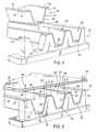 Each of thebeams50,50′,50″ haveflanges51,52 which are positioned on thepeak portions23 of thesupport members22. Each of thebeams50,50′,50″ also have amedial web53 between and extending below theflanges51,52. As shown in FIGS. 5 and 6 themedial web53 includes ainclined sidewall54 and a generallyflat floor68. Thetrough portion25 of thesupport members22 supports themedial web53 including theinclined side walls54 and theflat floor68. In thebridge20 of FIG. 1, the support members are positioned at opposite ends55,56 of thebeams50. Alternatively, thebeams50 can be supported by support members at intermediate positions along the length of thebeam50.