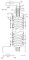 A first source providing varying electrical potential V1 is in circuit communication with the innercylindrical wall104 electrodes. More specifically,positive terminal702 andnegative terminal704 provide each pair of electrodes such as, for example,electrodes712 and710, respectively, with the varying electrical potential V1. This configuration of electrode connection is continued through the entire innercylindrical wall104 electrodes with the electrode next toelectrode712 being connected to the opposite terminal. In this manner, each pair of electrodes are of opposite polarity and have an insulator therebetween. A second source providing varying electrical potential V2 is in circuit communication with the outercylindrical wall102 electrodes. In particular,positive terminal706 andnegative terminal708 provide each pair of electrodes such as, for example,electrodes716 and714, respectively, with the varying electrical potential V2. This configuration of electrode connection is also continued through the entire outercylindrical wall102 electrodes with the electrode next toelectrode716 being connected to the opposite terminal. In this manner, each pair of electrodes are of opposite polarity and have an insulator therebetween.