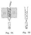 FIGS. 3A-3B are a series of representational drawings.3A depicts a mixture of labeled and unlabeled cells applied to a magnetic cell separation column means (depicting north and south magnetic fields) permitting elution of unlabeled cells and retention of labeled cells in the column.3B depicts removal of the magnetic field and elution of labeled cells into a separate suspension.