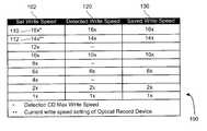 The selected device maximum record speed is indicated in the first box110 of the SetWrite Speed column102. In one embodiment of the present invention, the value in the SetWrite Speed column102 is then sent to the selected device. If the command sending the Set Write Speed value is accepted, as it should be for the maximum write speed, the selected optical recording device is then interrogated to determine the Detected Write Speed, or the write speed at which the selected device indicates it is set. The DetectedWrite Speed column120 contains the values of the write speeds with which the selected optical media device responds to interrogation. In the case where the value in the SetWrite Speed column102 equals the value in the DetectedWrite Speed column120, that value is saved as indicated in the SavedWrite Speed column130 of the table100.