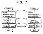 How the first embodiment works will now be described in more detail by referring to the accompanying drawings from FIG. 7 on. FIG. 7 shows an example of user programs. This is an example of data communication between the user program on the transmitting side (701 through703) and the user program on the receiving side (704 through706).Steps701 and704 define the environment necessary for communication. At this point, communication is yet to take place between the two programs.Steps702 and705 check to see if a communication target and is ready to communicate. Step703 transmits user data to the communication target checked instep702. There is no need for the user. program to become aware of the packet size in effect. That is, there are no concept of a packet size or an ACK unit to be taken into account at this stage of communication. The packet size and ACK unit are concepts defined by theoperating system2403, to be described later.