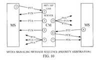 FIG. 10 depicts a sequence of group communication media signaling messages demonstrating a higher priority CD interrupting a lower priority CD having the talker privilege.